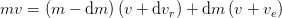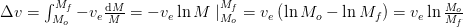 denotes it change. If we assume that the expelled velocity of the gas remains constant throughout, we can easily integrate the above expression to find the incremental change in velocity as the total rocket mass (dry mass + propellant) changes from an intial mass